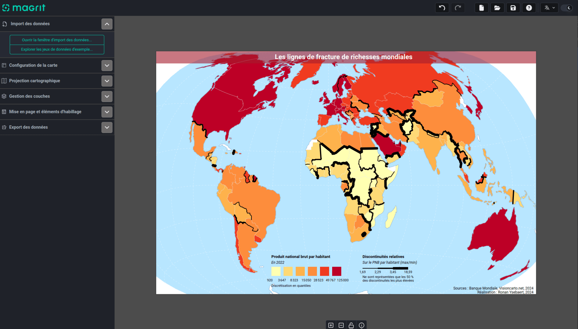 Magrit est une application de cartographie thématique, principalement dédiée à l'apprentissage et à l'enseignement de la cartographie mais pouvant également être utilisée par tout utilisateur désireux de réaliser des cartes thématiques (journalisme, recherche, etc.).