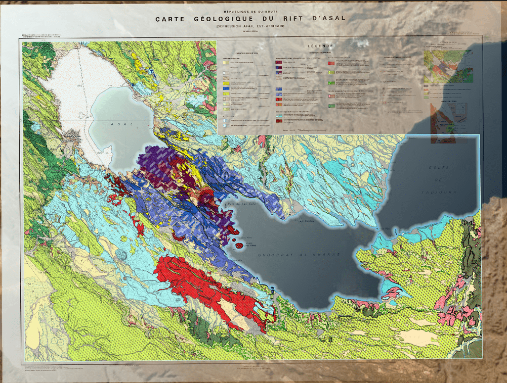 Géoréférencement et digitalisation de la carte du rift d’Asal levée par Laurent Stieltjes (date non précisée) sur la commande de l’Institut supérieur d’étude et de recherches scientifiques et techniques de Djibouti, coéditée par le Centre national de la recherche scientifique et du Bureau de recherches géologiques et minières.